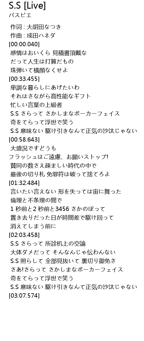 | [00:45.765] | S.S さらって さかしまなポーカーフェイス |