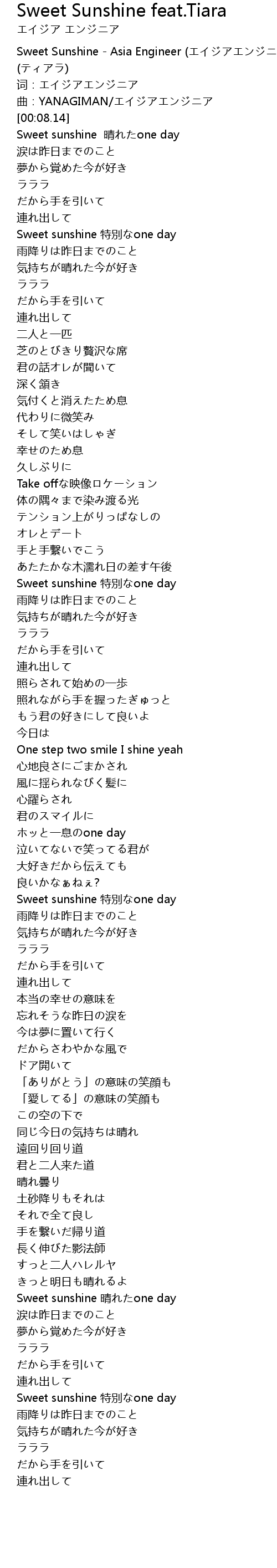 | [00:01.25] | Sweet Sunshine - Asia Engineer (エイジアエンジニア)/Tiara (ティアラ) |
