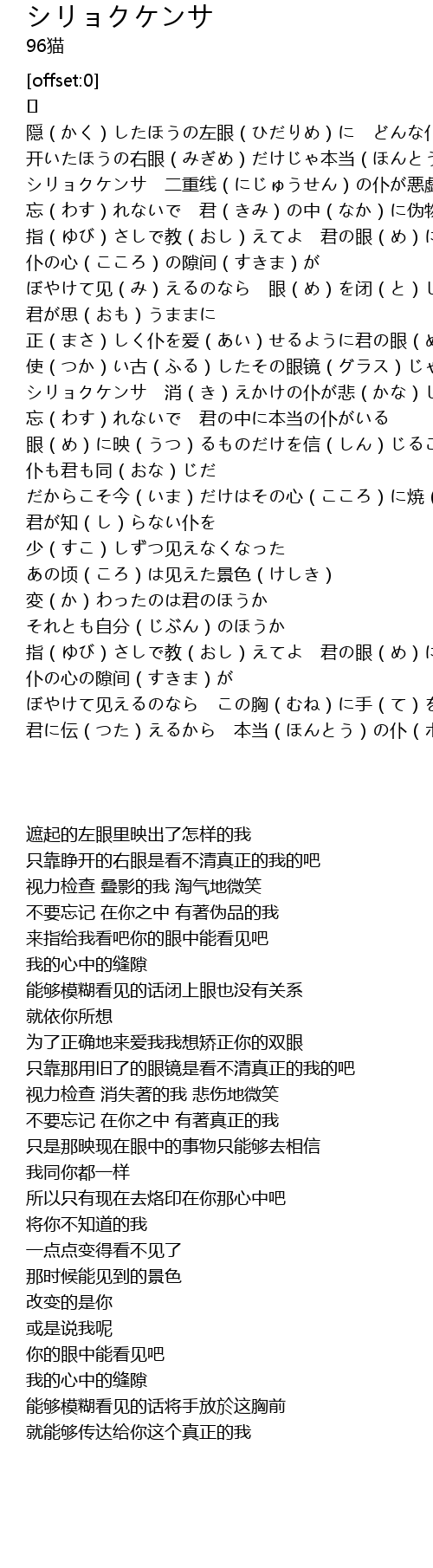 | [00:38.319] | シリョクケンサ 二重线(にじゅうせん)の仆が悪戯(いたずら)に微笑(ほほえ)む |