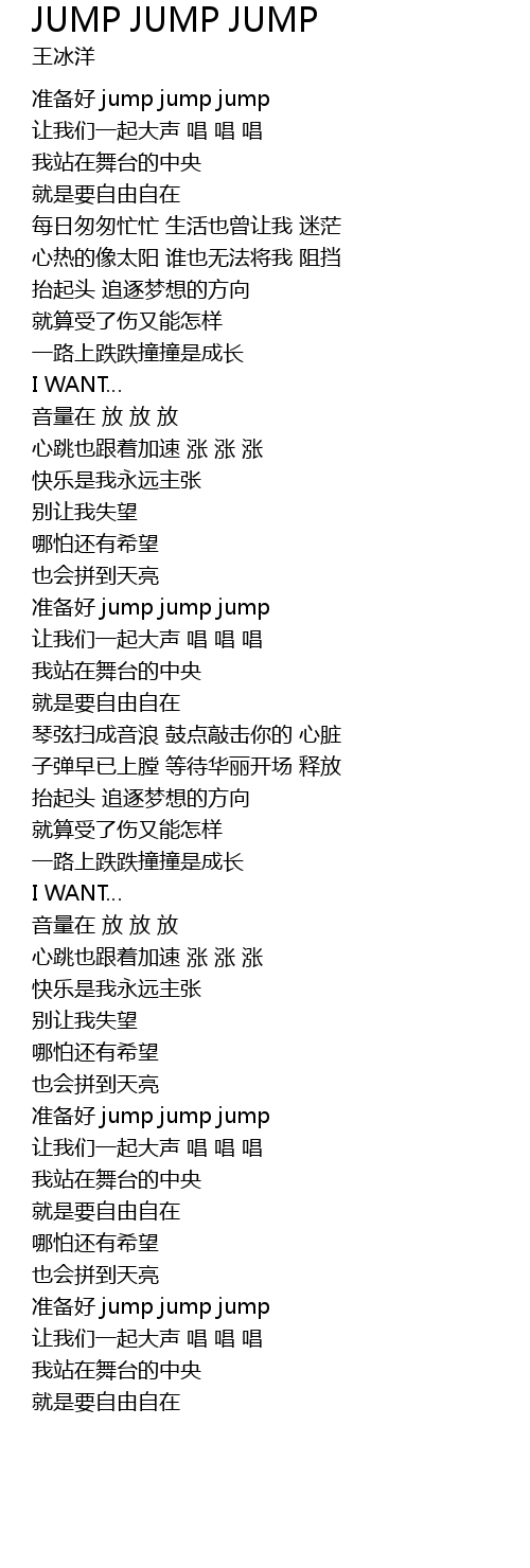 | [03:21.110] | zhǔn bèi hǎo jump jump jump |