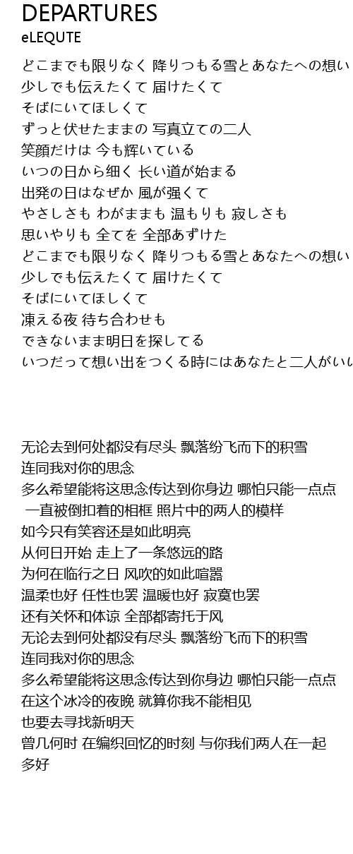 | [01:08.38] | どこまでも限りなく 降りつもる雪とあなたへの想い |