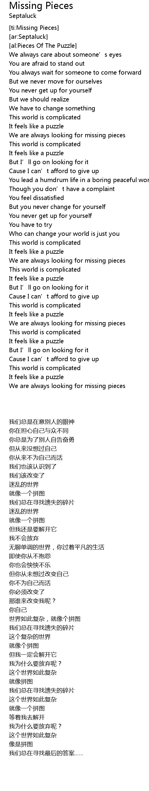 | [01:39.71] | We are always looking for missing pieces |