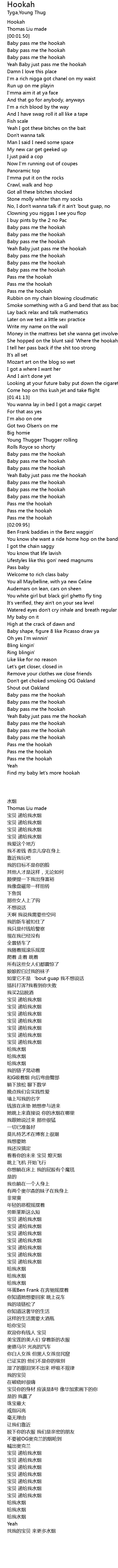 | [01:25.28] | She hopped on the blunt said 'Where the hookah y'all?' |