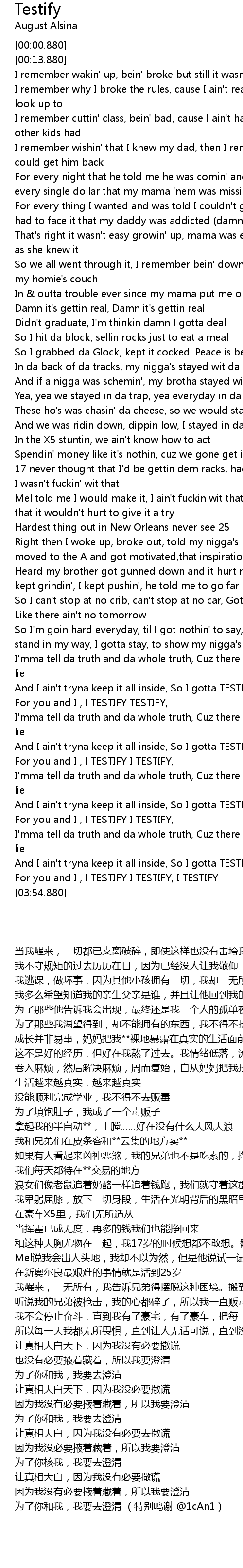 And I ain't tryna keep it all inside, So I gotta TESTIFY |