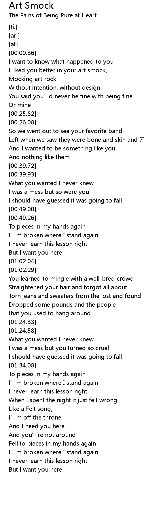 | [01:16.91] | Torn jeans and sweaters from the lost and found |