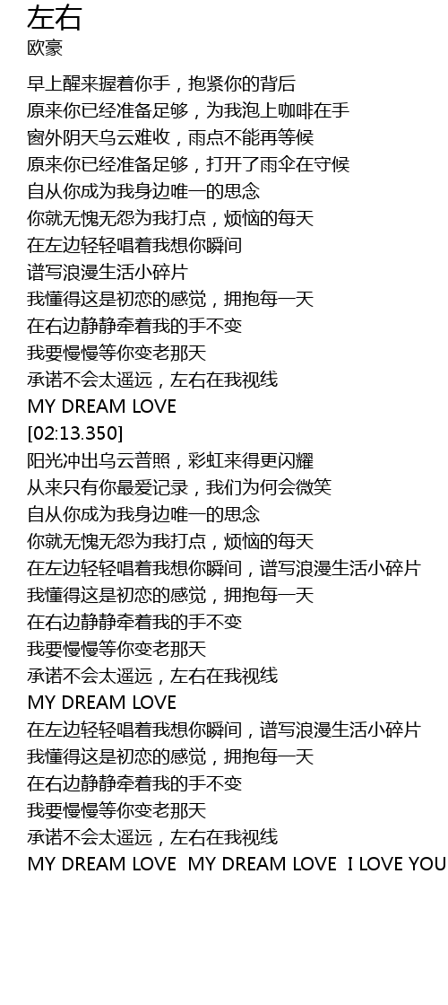 | [02:33.331] | 在左边轻轻唱着我想你瞬间,谱写浪漫生活小碎片 |