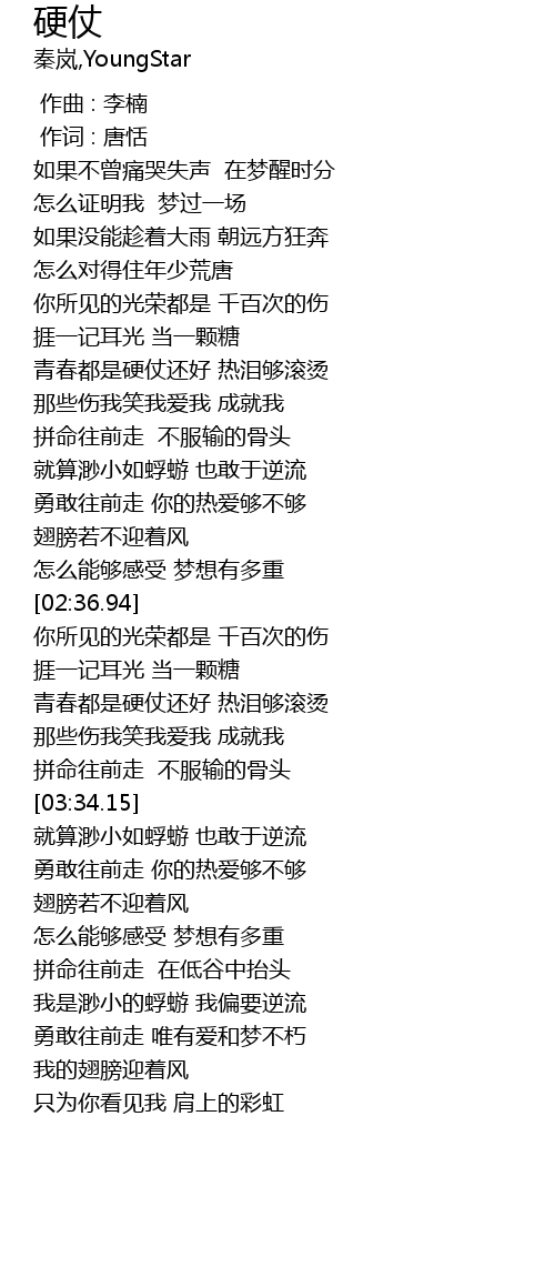 | [03:15.96] | 青春都是硬仗还好 热泪够滚烫 |