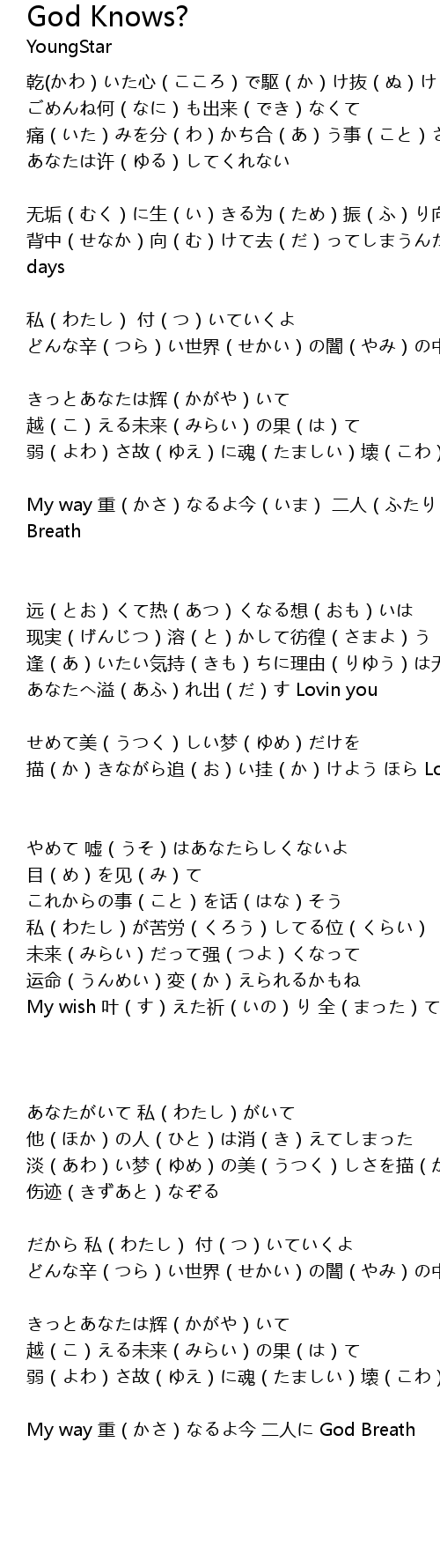 | My wish 叶(す)えた祈(いの)り 全(まった)ては God knows | |