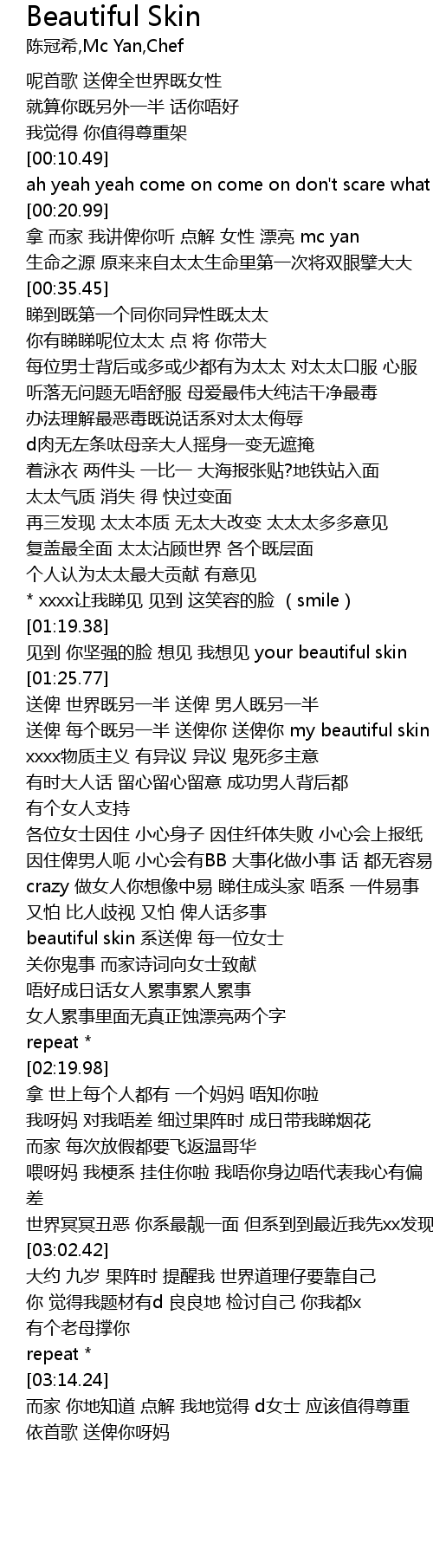 | [01:30.77] | 送俾 每个既另一半 送俾你 送俾你 my beautiful skin * |
