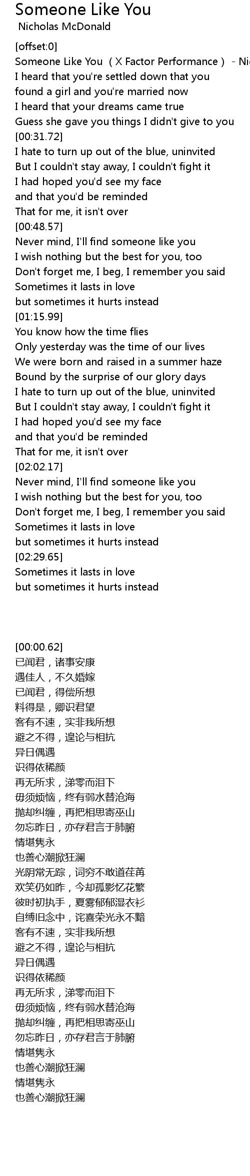 | [00:00.62] | Someone Like You (X Factor Performance) - Nicholas McDonald |