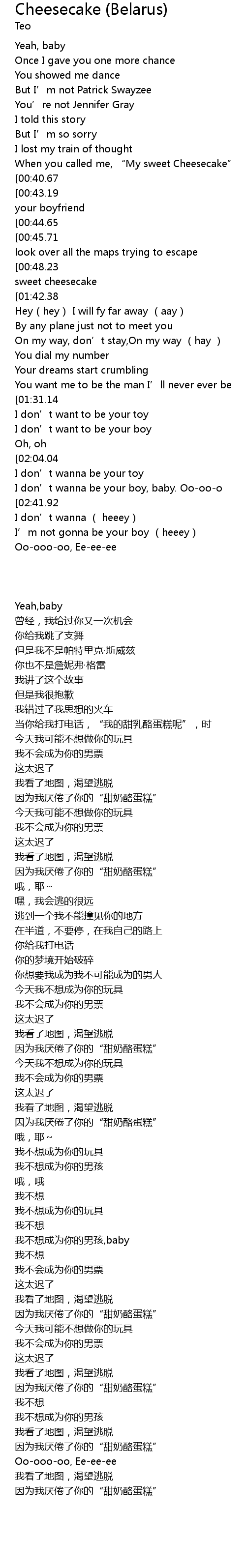 | [00:38.15][00:48.23][01:28.64][01:38.75][02:21.72] | ' cause I' m tired of your sweet cheesecake |