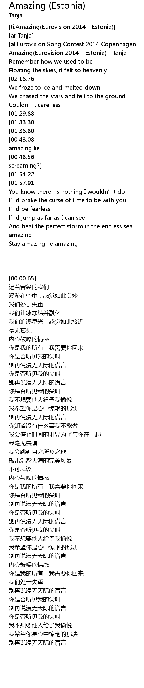 | [00:00.65] | Amazing(Eurovision 2014 - Estonia) - Tanja |