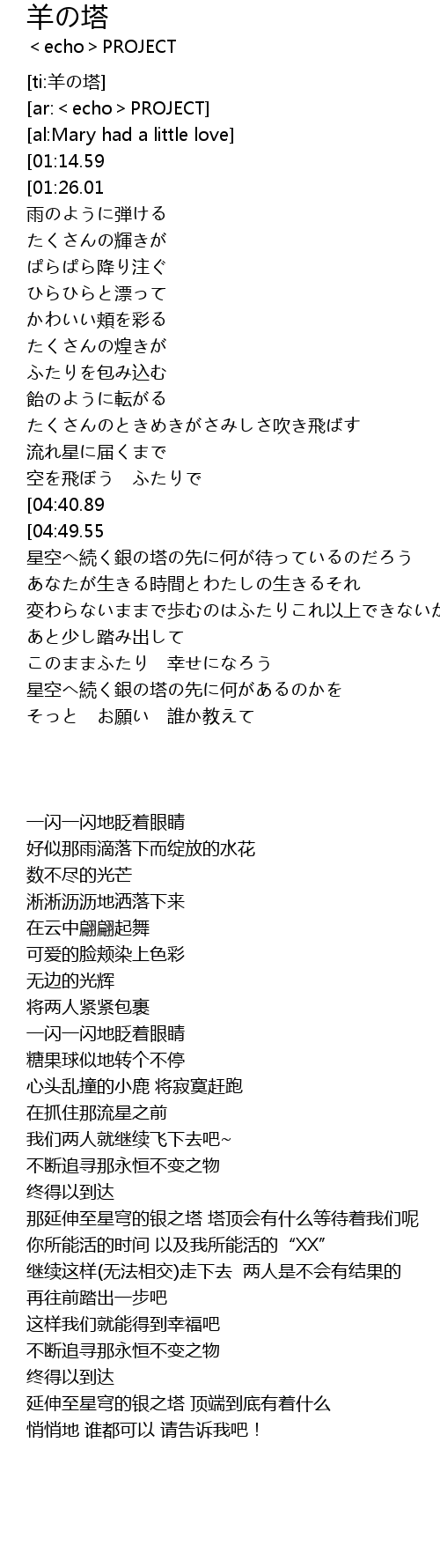 | [02:25.07] | 星空へ続く銀の塔の先に何が待っているのだろう |