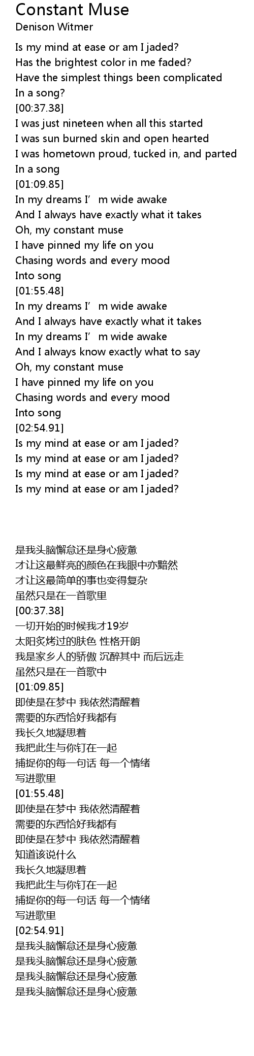 | [03:23.88] | Is my mind at ease or am I jaded? |