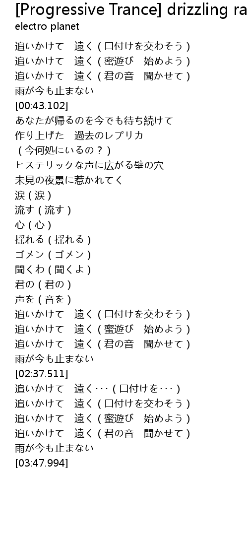 | [01:59.255] | 追いかけて 遠く(口付けを交わそう) |