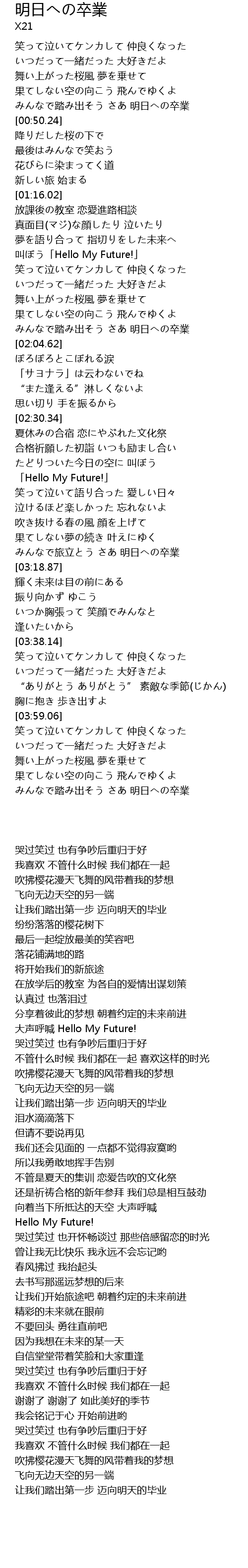 | [00:41.29] | みんなで踏み出そう さあ 明日への卒業 |