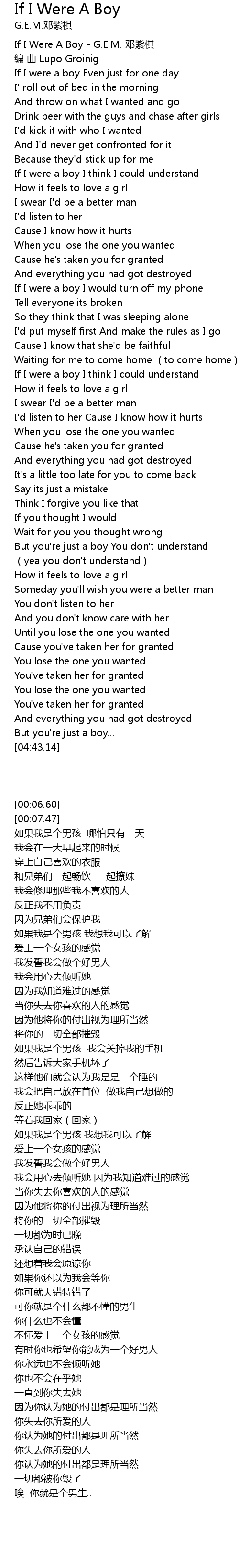 | [00:06.60] | If I Were A Boy - G.E.M. 邓紫棋 |