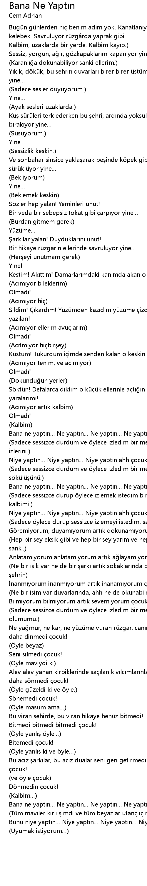 | Ne ya mur, ne kar, ne yü zü me vuran rü zgar, can m yakan ac tan sonbahar, daha dinmedi ocuk! | |