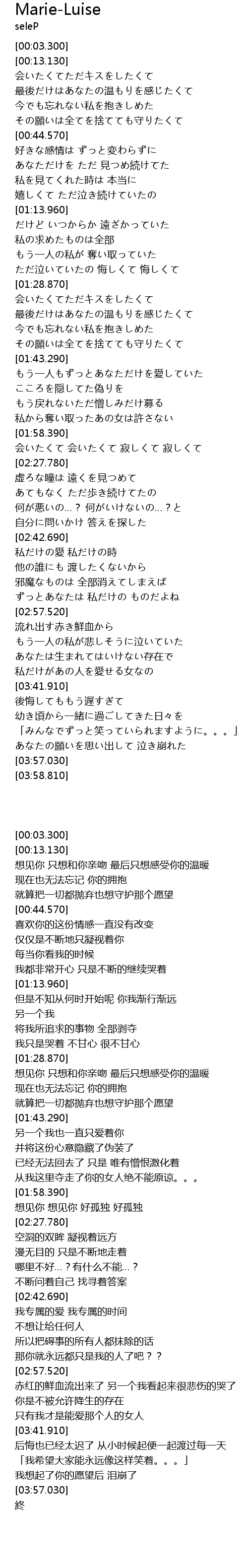 | [03:27.570] | 流れ出す赤き鮮血から もう一人の私が悲しそうに泣いていた |