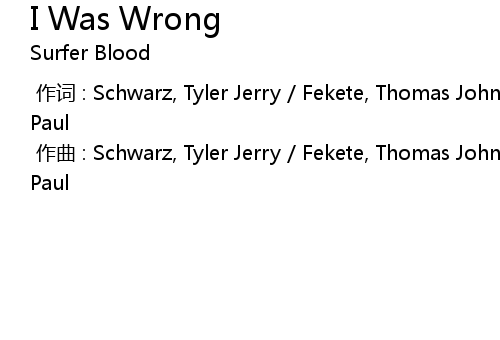 | [00:00.000] | zuò qǔ : Schwarz, Tyler Jerry Fekete, Thomas John Pitts, John Paul |