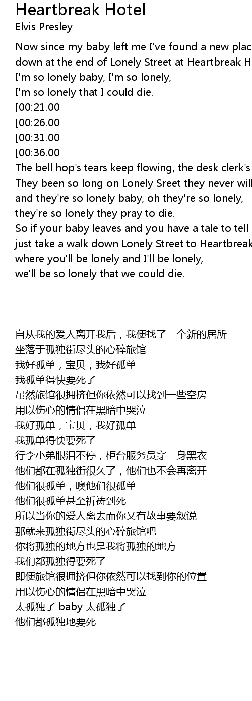 [00:05.00] down at the end of Lonely Street at Heartbreak Hotel.
