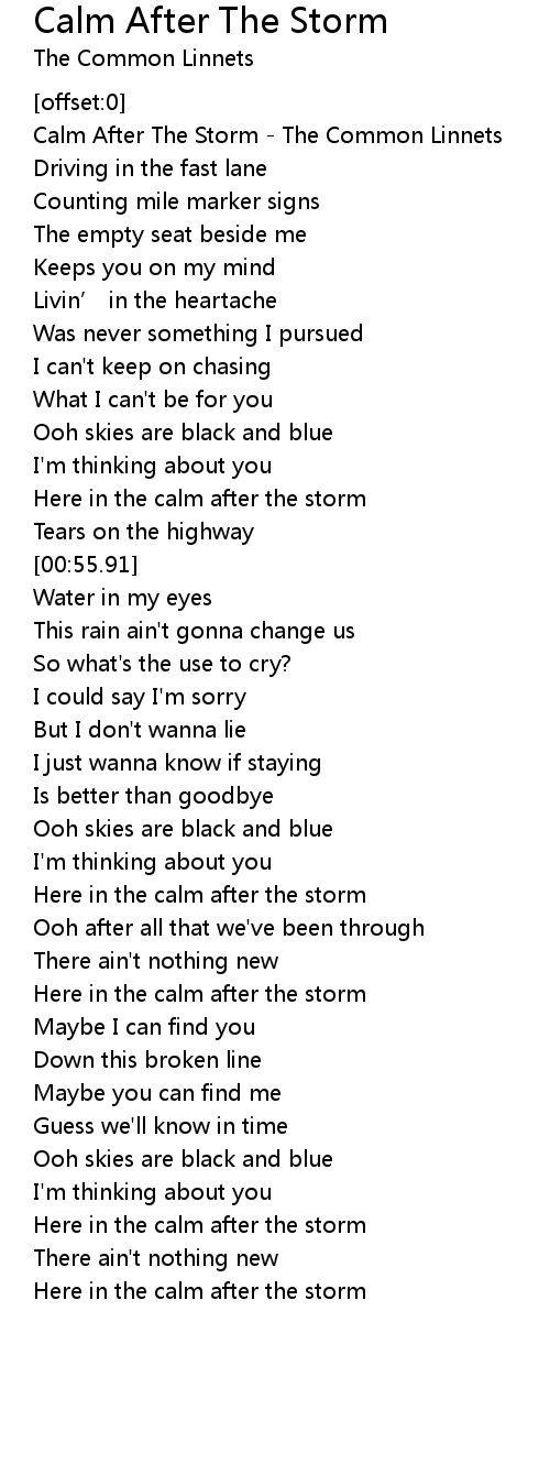 | [00:00.58] | Calm After The Storm The Common Linnets |