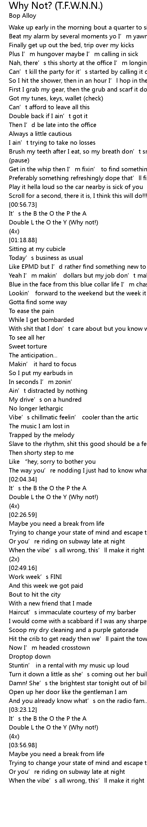 | [00:33.75] | Got my tunes, keys, wallet check |