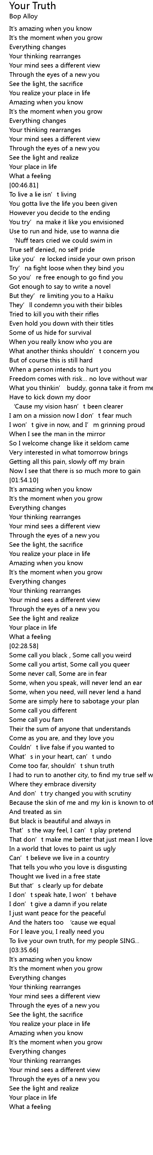 | [03:33.47] | To live your own truth, for my people SING... |