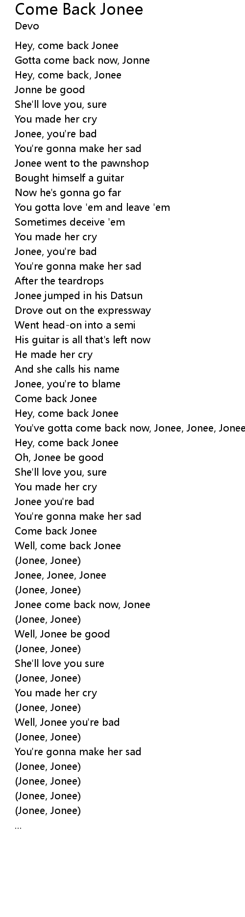 You've gotta come back now, Jonee, Jonee, Jonee |