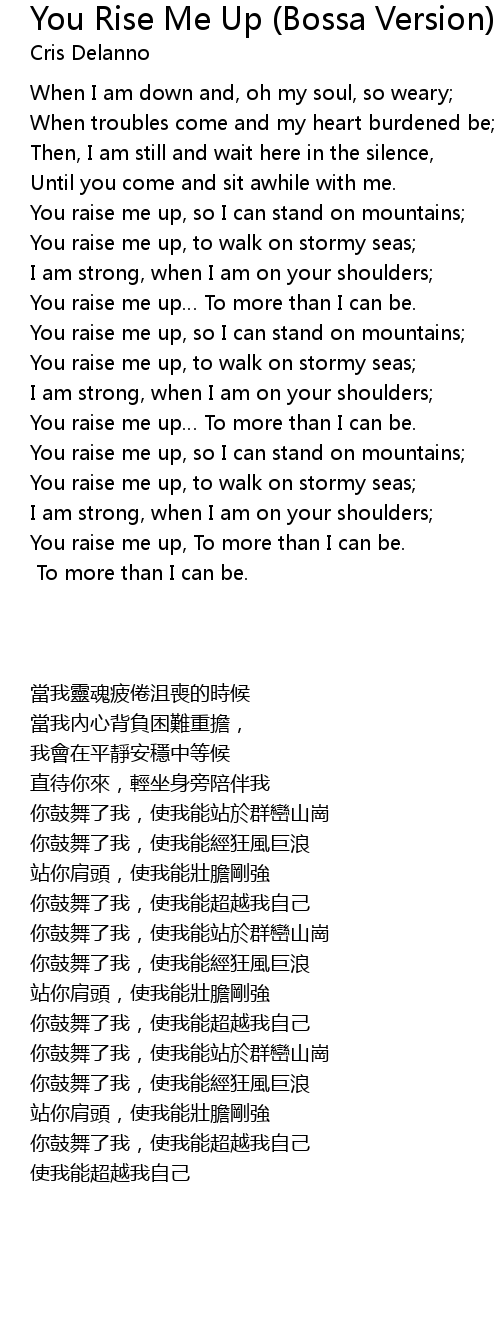 | [02:36.84] | You raise me up, To more than I can be. |