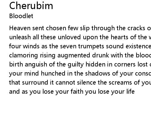Heaven sent chosen few slip through the cracks out of the house of bondage unleash all these unloved upon the hearts of the wicked the four angels hold the four winds as the seven trumpets sound existence sustained on hatred fervoring clamoring rising augmented drunk with the blood of the martyrs innocence died at birth anguish of the guilty hidden in corners lost cornered in the dephts of your mind hunched in the shadows of your conscience the four bloodstained walls that surround it cannot silence the screams of your guilt bow now you infidel and as you lose your faith you lose your life |