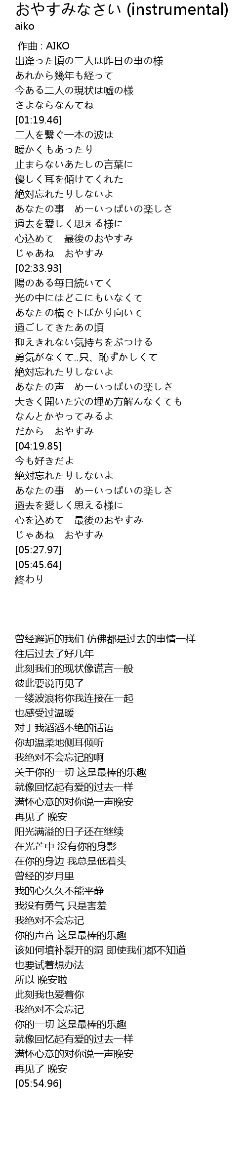 | [05:04.95] | 心を込めて 最後のおやすみ |