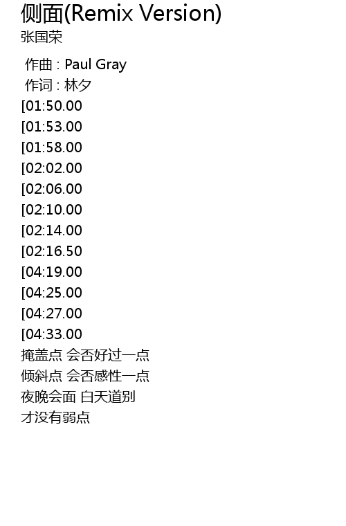 | [03:49.00][01:53.00] | 你眼光只接触我侧面 |