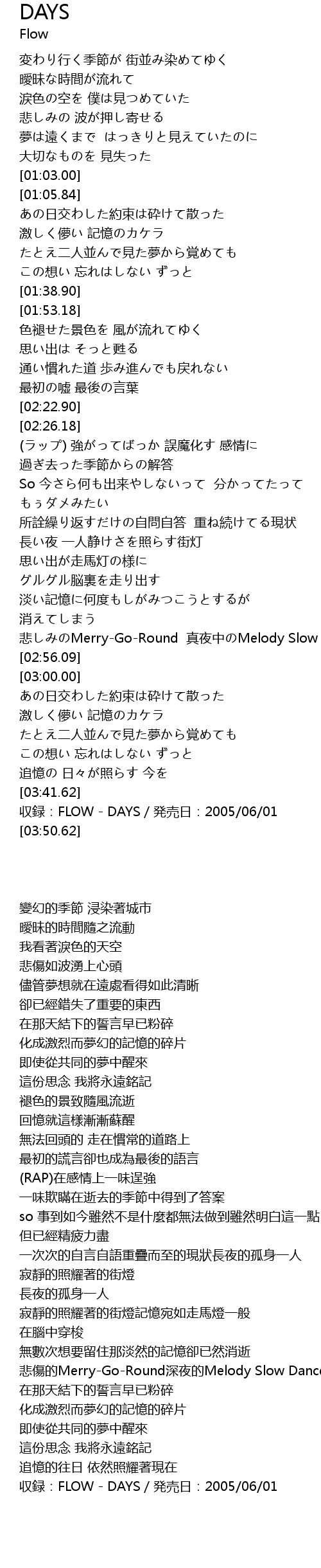 | [03:43.62] | 収録:FLOW - DAYS/発売日:2005/06/01 |