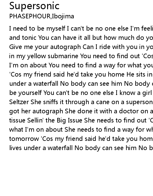 I need to be myself I can't be no one else I'm feeling supersonic Give me gin and tonic You can have it all but how much do you want it? You make me laugh Give me your autograph Can I ride with you in your B.M.W ? You can sail with me in my yellow submarine You need to find out 'Cos no one's gonna tell you what I'm on about You need to find a way for what you want to say But before tomorrow 'Cos my friend said he'd take you home He sits in a corner all alone He lives under a waterfall No body can see him No body can ever hear him call You need to be yourself You can't be no one else I know a girl called Elsa She's into Alka Seltzer She sniffs it through a cane on a supersonic train She made me laugh I got her autograph She done it with a doctor on a helicopter She's sniffin in her tissue Sellin' the Big Issue She needs to find out 'Cos no one's gonna tell you what I'm on about She needs to find a way for what she wants to say But before tomorrow 'Cos my friend said he'd take you home He sits in a corner all alone He lives under a waterfall No body can see him No body can ever hear him call |