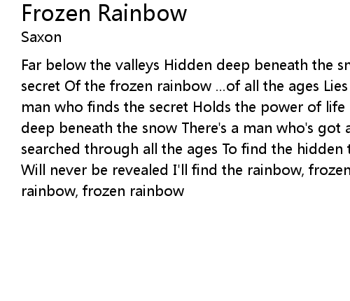| Far below the valleys Hidden deep beneath the snow There's a man who guards the secret Of the frozen rainbow ...of all the ages Lies hidden neath the ice The man who finds the secret Holds the power of life Far below the valleys Hidden deep beneath the snow There's a man who's got a secret Waiting to be told I've searched through all the ages To find the hidden truth The secret of the rainbow Will never be revealed I'll find the rainbow, frozen rainbow I'll find the rainbow, frozen rainbow |