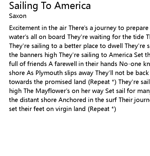Excitement in the air There's a journey to prepare They check the food and water's all on board They're waiting for the tide The sails are open wide They're sailing to a better place to dwell They're sailing to America (*) Fly the banners high They're sailing to America Set the rigging high The quayside's full of friends A farewell in their hands No-one knows if they will reach the shore As Plymouth slips away They'll not be back again They're sailing off towards the promised land (Repeat *) They're sailing to America Fly the banners high The Mayflower's on her way Set sail for many days The lookout searching for the distant shore Anchored in the surf Their journey's at an end The pilgrims set their feet on virgin land (Repeat *) |