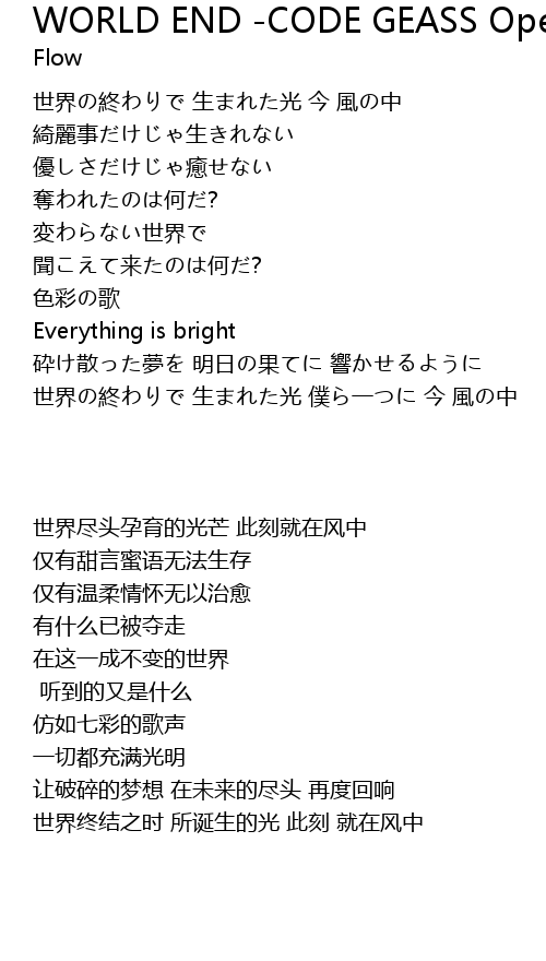 | [00:02.53] | 世界の終わりで 生まれた光 今 風の中 |