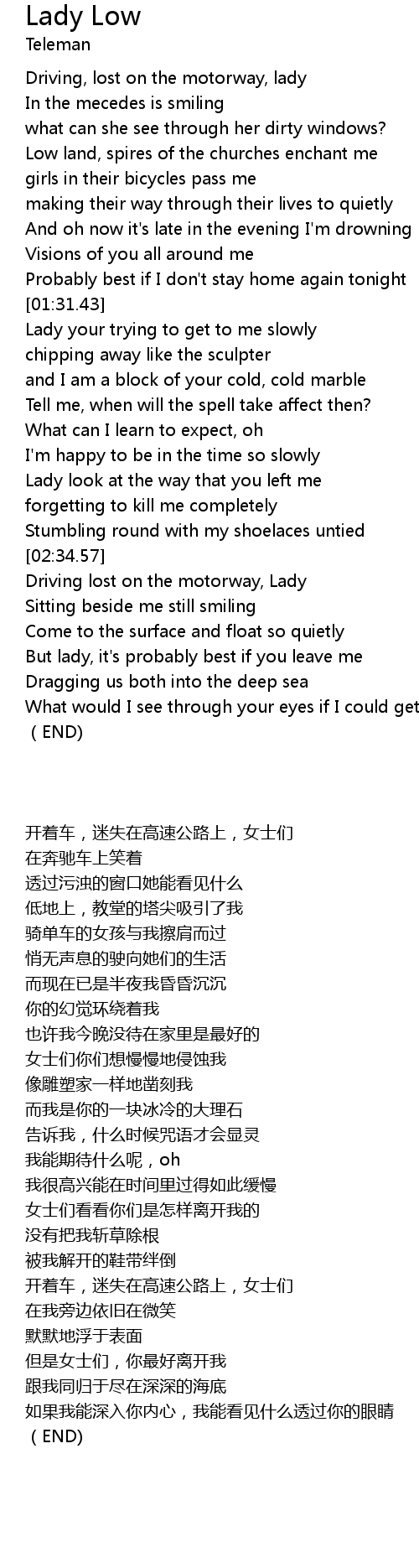 | [00:43.70] | Driving, lost on the motorway, lady |