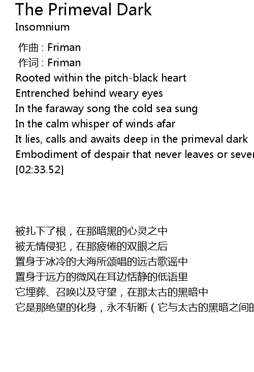 | [02:15.70] | It lies, calls and awaits deep in the primeval dark |