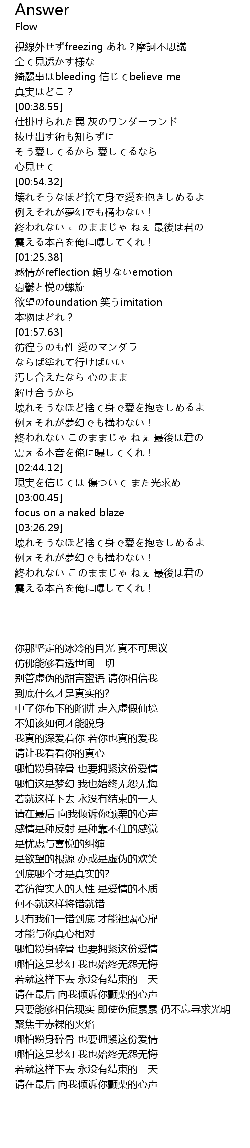 | [00:31.28] | 綺麗事はbleeding 信じてbelieve me |