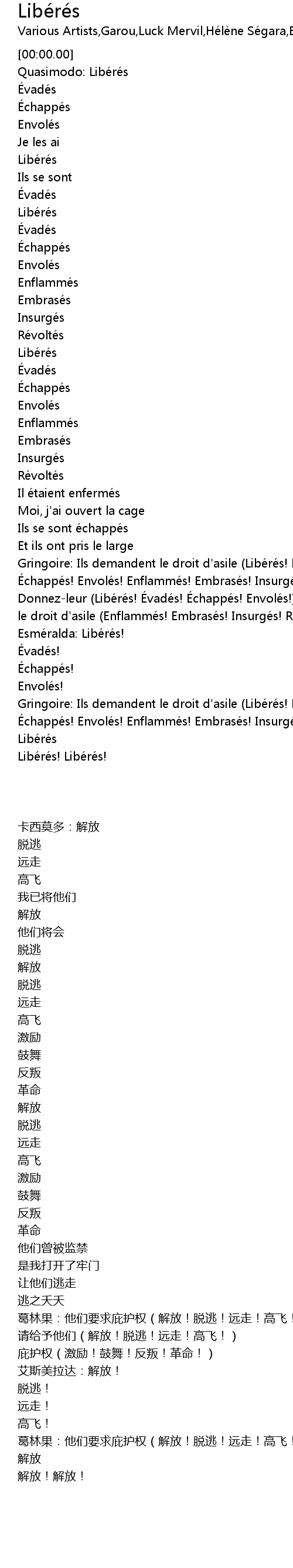 | [01:26.63] | Gringoire: Ils demandent le droit d' asile Libé ré s! É vadé s! É chappé s! Envolé s! Enflammé s! Embrasé s! Insurgé s! Ré volté s! |