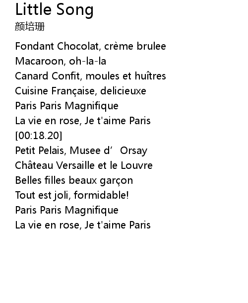 | [00:14.52] | La vie en rose, Je t' aime Paris |