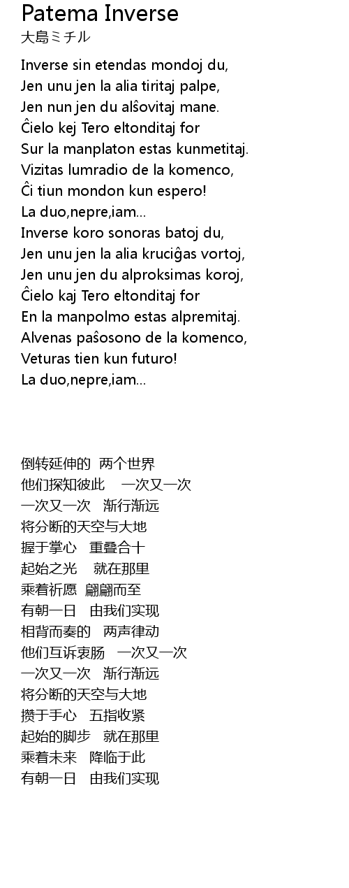 | [00:12.090] | Inverse sin etendas mondoj du, |