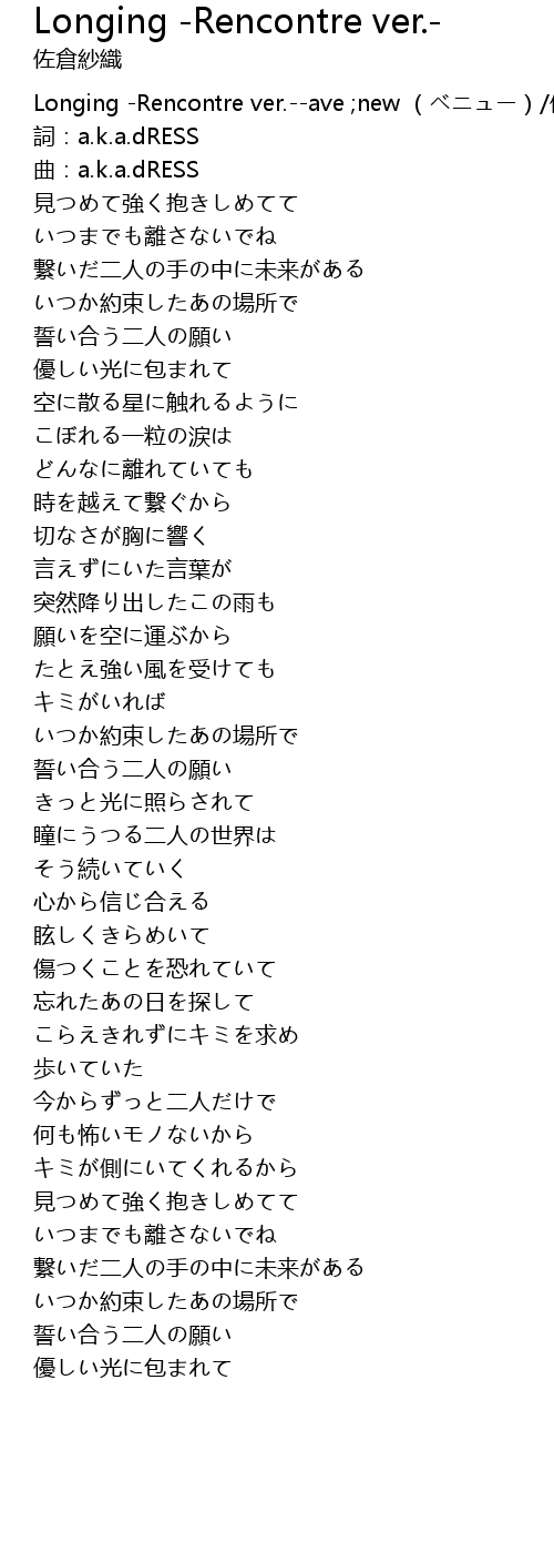 | [00:00.00] | Longing -Rencontre ver.--ave ;new (ベニュー)/佐倉紗織 |