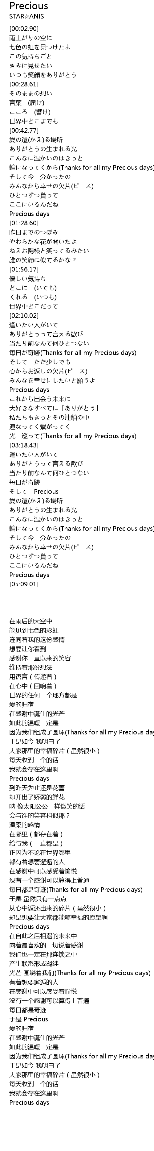 | [02:27.46] | měi rì qí jī Thanks for all my Precious days |