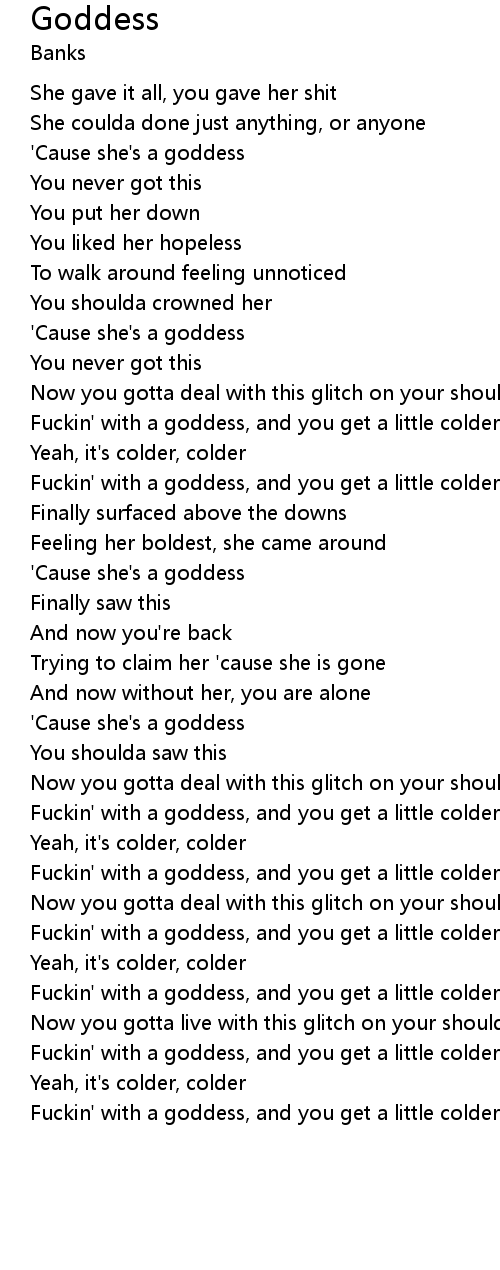 | [00:49.35] | Fuckin' with a goddess, and you get a little colder |