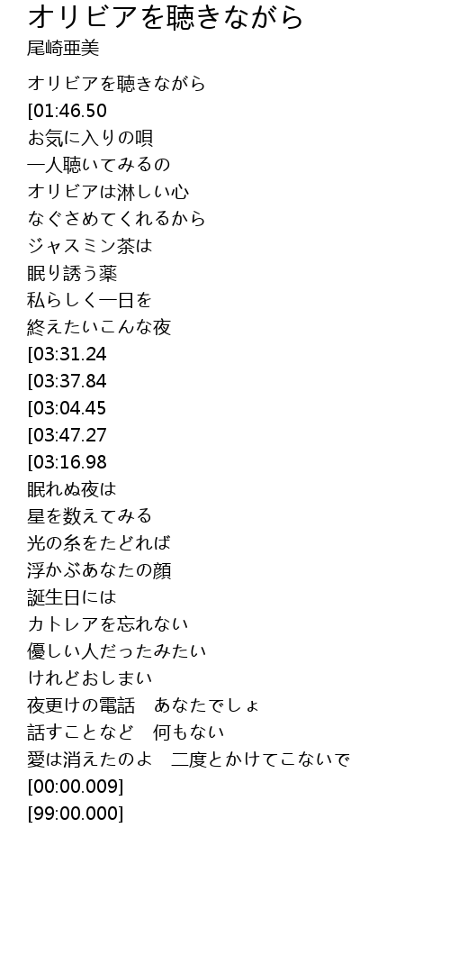 | [00:08.00][01:46.50][04:12.27] | 川嶋あい-オリビアを聴きながら |