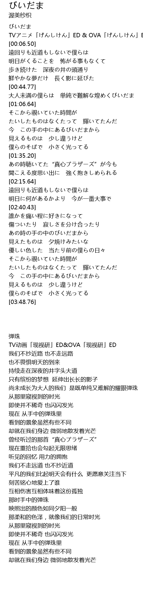 | [00:45.99] | 大人未満の僕らは 単純で難解な煌めくびいだま |