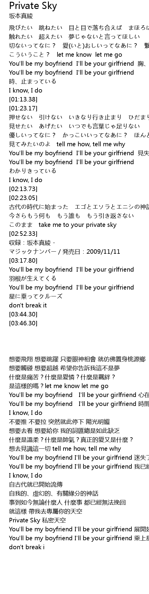 | [03:19.80] | You'll be my boyfriend I'll be your girlfriend 羽根が生えてくる |
